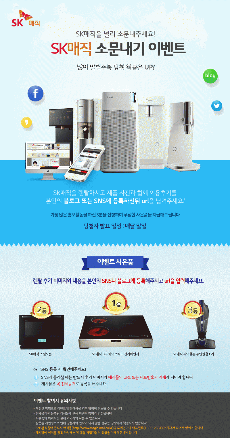 매직몰을 알려라! SNS이벤트 2020-02-27 SK매직 주요 고객사 생활의 SK매직, 지속적인 품질의 고급화와 기술력 혁신을 통하여 글로벌 기업으로서 비전을 실현해가고 있습니다. 1833-2235 고객님께 가장 알맞은 제품으로친절하게 상담드리겠습니다.